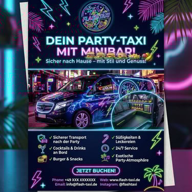 Flash-Taxi ist ein spezialisiertes Taxi- & Erlebnis-Service, das Menschen nach Partys, Events oder Cannabis-Club-Besuchen sicher nach Hause bringt – inklusive Essen an Bord.